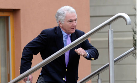 A gagged demonstrator holds placards during a protest over the December 2010 arrest of WikiLeaks founder Julian Assange outside the City of Westminster Magistrates' Court in central London.